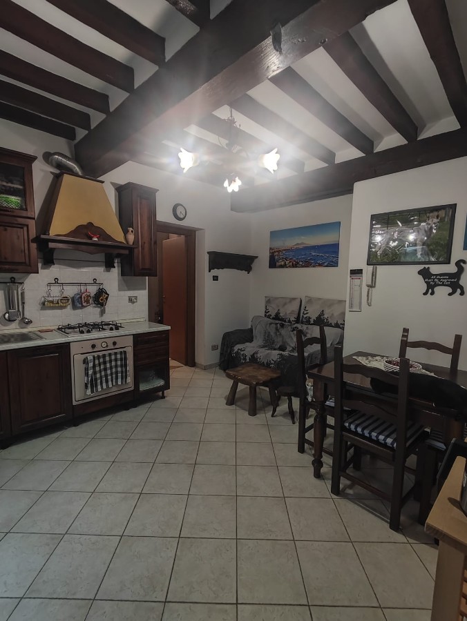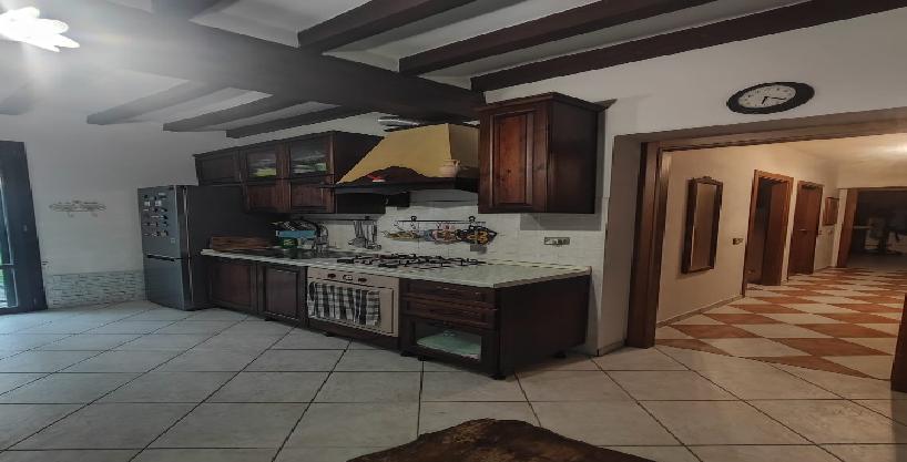 Soggiorno con cucina a vista, che affaccia direttamente sul giardino di 170 mq., piantumato.